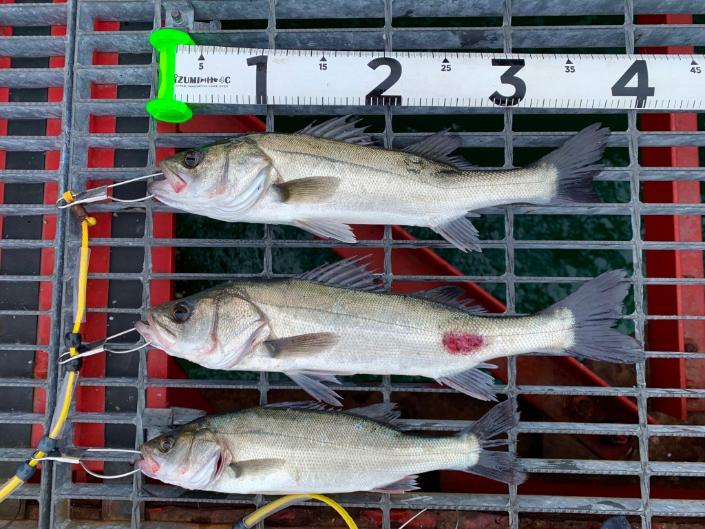 ズボ釣りでもシラサエビをサシエサにハネ1匹セイゴ6匹釣って帰られたお客様もいらっしゃいました。エビ撒き釣りと同様、中層付近の4mから釣れていました。