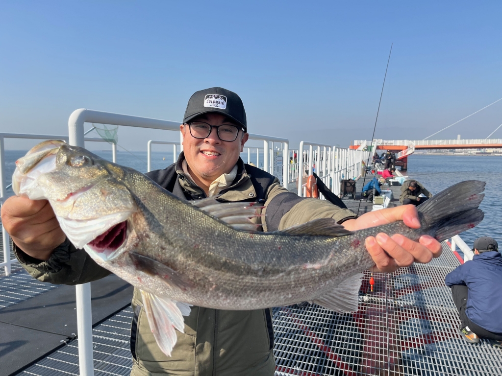 西山様、エビ撒き釣り最後の1投で68cmのスズキをキャッチ