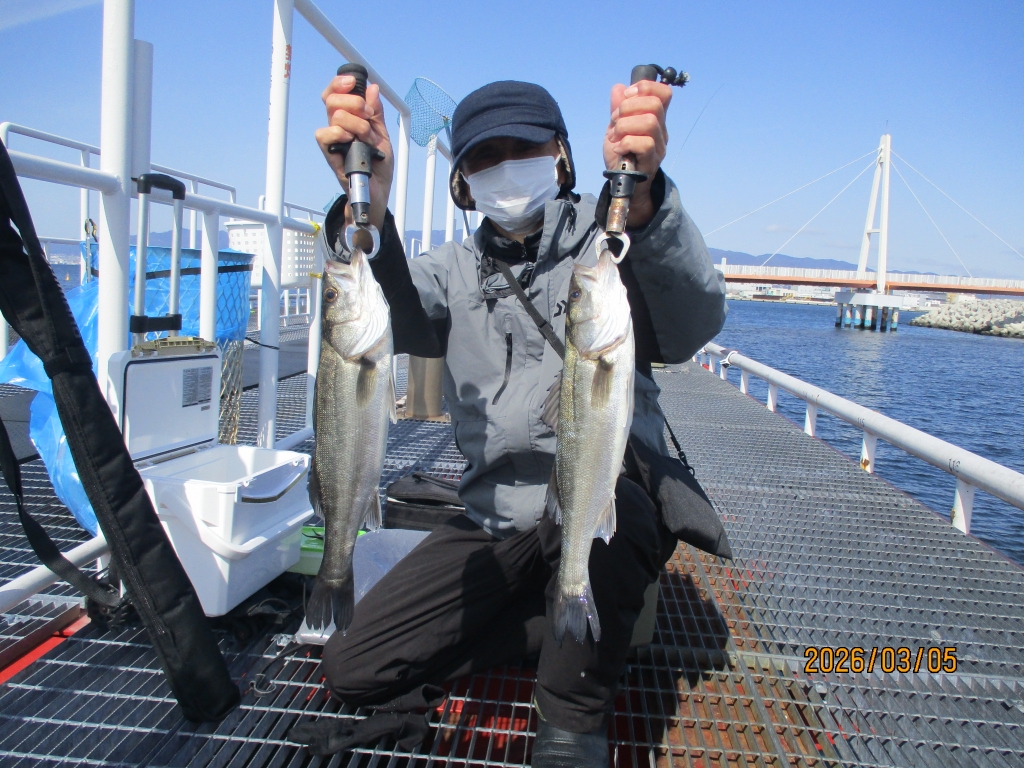 ここ最近はエビ撒き釣りでハネに混じりながらチヌがよく顔を見せています。30cm台がほとんどですが、塩焼きに一品と考えるとちょうど良いサイズでとっても美味しそうです。どのチヌも共通して釣り場60〜70番辺りの柱周りがよく釣れております。タナもハネと変わらないので、同時に狙えるのが利点ですね。ただ柱周りを攻めるとなると、仕掛けが引っかかることが多くなるため、風が強くウキが煽られたり、潮が早くて仕掛けがよく流される場合には注意が必要です。