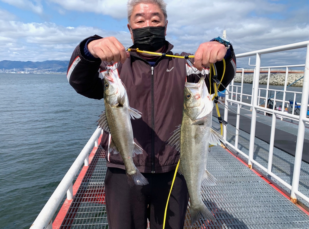 11時を過ぎ、風がだんだんと強くなってきました。それに比例するように潮も西から東に向かって強く流れ始めました。潮の上の方が流れているようですが、ウキ釣りの方はなかなか釣りにくそうにされています。ですがハネ52cm、スズキ63cmと、大型が釣れました。やはりお昼間際から過ぎぐらいの時合いは大型がかかりやすいです。