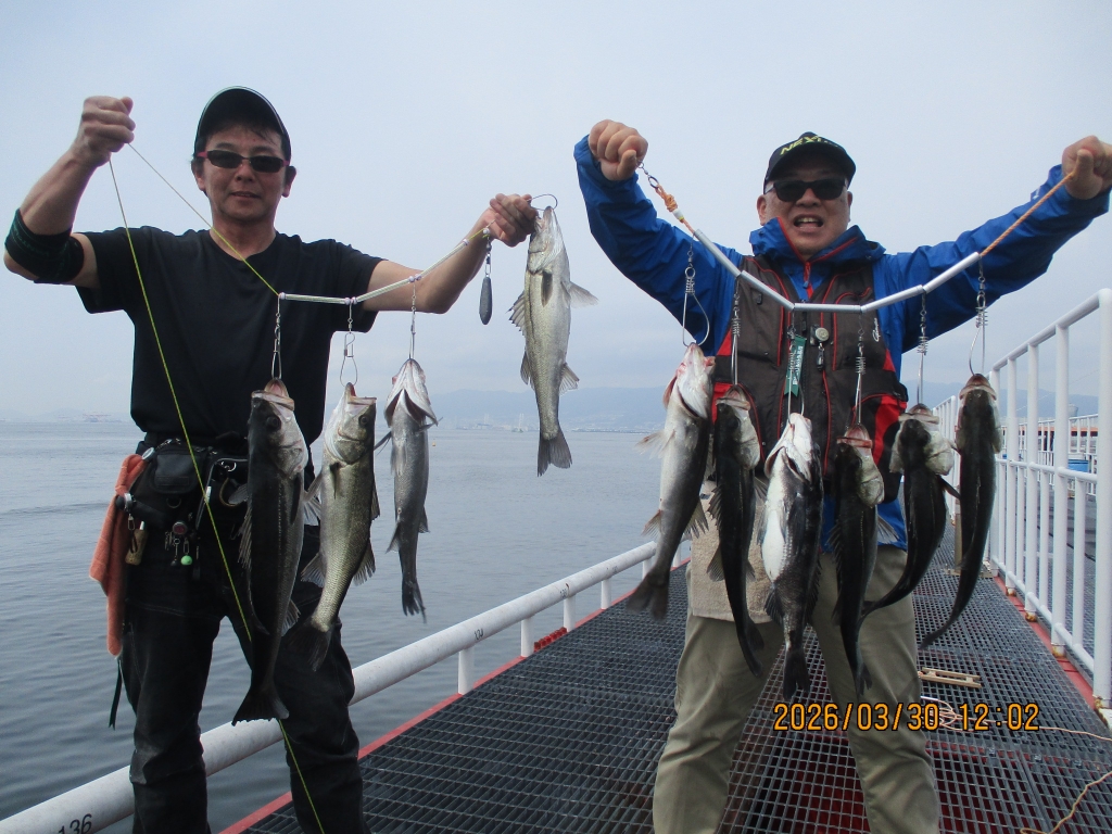 本日1本目はエビ撒き釣り(ウキ)よりハネ43cmが釣り場東内側で釣れています。タナは4ヒロです。続けてそのお隣のお客様が同じサイズのハネを同じく4ヒロで釣られています。水温が12度を平均して上回るようになってから、4ヒロ前後の釣れ方が多くなってきましたね。